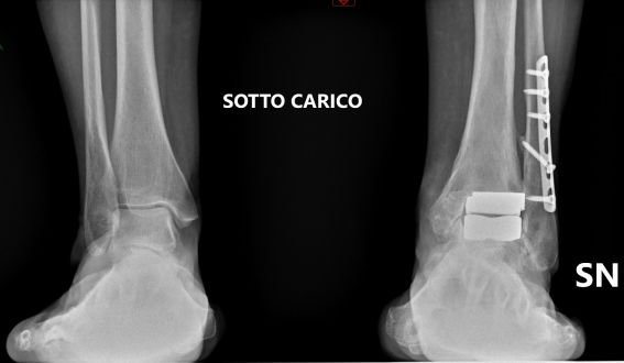 Questo percorso riabilitativo si completa in genere nel giro di due-tre mesi dall’intervento, periodo nel corso del quale il paziente esegue periodici controlli ortopedici e valutazioni radiologiche intermedie, eseguite inizialmente fuori carico, successivamente nelle proiezioni funzionali in ortostatismo per controllare il corretto recupero degli assi anatomici oltre che la regolare progressione dei processi di osteointegrazione (vedi Figura).